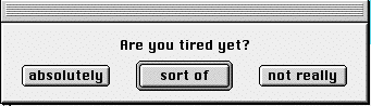 Dialog choose: 'Are you tired yet?' labels: #( 'absolutely' 'sort of' 'not really') values: #(#yes #maybe #no) default: #maybeThis example shows how to provide multiple options and specify the return values for each option displayed.