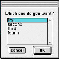 This example shows how to provide the user with a list of options. Both fromList: and values: keywords need a SequenceableCollection or subclass as an argument. The fromList: argument is the text to be displayed on the screen. The values: argument contains the value returned when the user selects an item. When the user selects the K'th item in the list, the K'th element of the values: argument is returned. The lines: keyword sets the maximum number of items that will fit in the window before the user has to scroll. The cancel: keyword requires a block as an argument. When the user cancels the dialog, the result of running the block is returned. While the block given here just returns a value, it could do more useful things like close files.