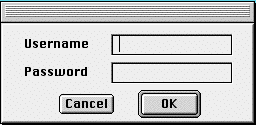 The program above generates the dialog shown. The textLine: keyword requires a model. When the user enters text and clicks on the "OK" button, the model gets the value the user entered. '' asValue returns a ValueHolder on a string. ValueHolders are subclasses of Model. The statement "user value -> pass value" gets the values from the ValueHolders and creates an association from them. This is done here just to show that the values have been changed.